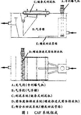 渦凹氣浮(CAF)係(xì)統是世界獨(dú)創(chuàng)的專利水處理設備,也是美國商務部和環保局(jú)的出口推薦技術。CAF是專門(mén)為去除工業和城市汙水中的油脂(zhī)、膠狀(zhuàng)物及固體懸浮(fú)物(SS)而設計的係統。整個氣浮係統共由五部分組成(chéng),如圖1所示: