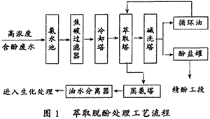 該廠各種高濃度含酚廢水(shuǐ)流入氨水池均化,池底的焦化類(lèi)物質定期抽出。高濃(nóng)度含酚廢水經焦碳過濾器除(chú)油,使出(chū)水符合(hé)進生化處理裝置的要求。吸附油的焦碳定期用(yòng)蒸汽(qì)吹脫。除油後的含(hán)酚廢水(shuǐ)經冷卻器冷卻至55~65℃進入萃取塔(tǎ)上部。萃取劑選用N-503煤油,由循環油泵打入萃取塔底部。溶劑油與高濃度含酚廢水在萃取塔(tǎ)中逆流接觸,絕大部分酚轉(zhuǎn)移至溶劑油中,溶劑油(yóu)由萃(cuì)取塔頂(dǐng)溢流進入堿洗塔與堿接觸生成酚鹽。溶(róng)劑油經堿洗(xǐ)後進入中間油槽,循環(huán)使用。